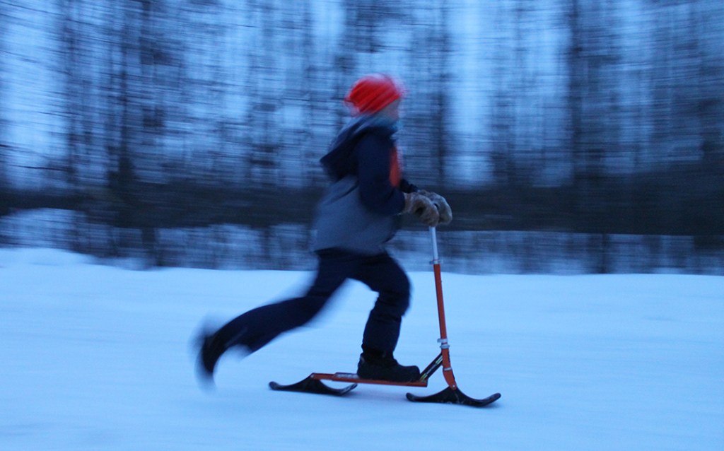 In this photo I had my shutter open for a 30th of a second and moved along with the child as he sped past me. This created a blurred background, but some of the child/ski-ter are in focus. This was a really fun assignment.